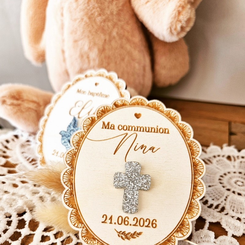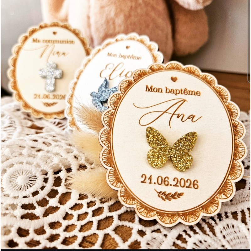 Un très joli médaillon aimanté en bois avec sa décoration au choix. Vous pourrez l'offrir en cadeau souvenir lors de la fête de votre enfant. Un cadeau original chargé d'émotion et décoratif à la fois.