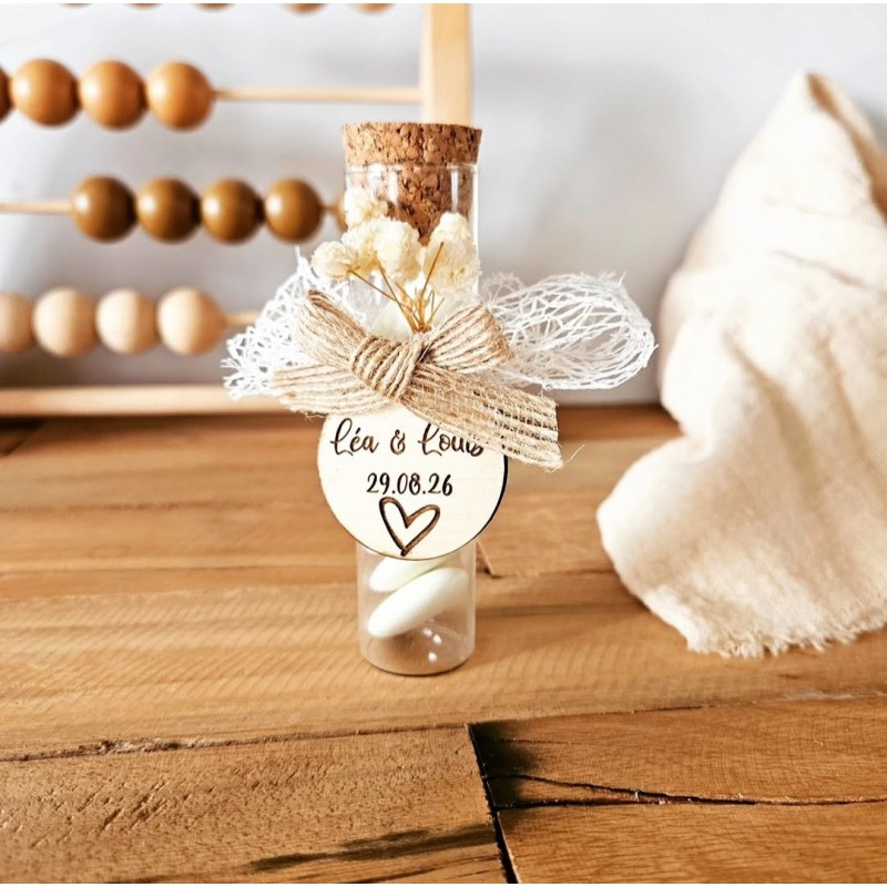 Une éprouvette ornée d'un médaillon gravé en bois avec des fleurs séchées pour toute occasion baptême mariage et baptême.