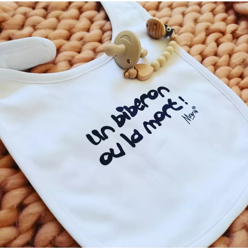 Bavoir blanc sérigraphié "un biberon ou la mort"
