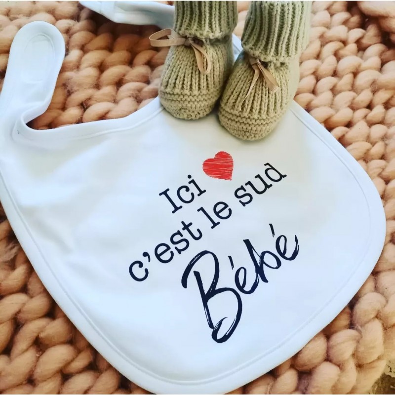 Bavoir blanc sérigraphié "ici c'est le sud bébé"