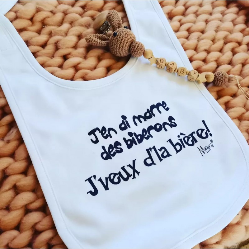 Très beau bavoir blanc sérigraphié "j'en ai marre des biberons je veux de la bière !"