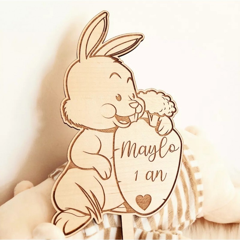 Un lapin avec sa carotte en cake topper bois pour décorer et embellir votre gâteau de fête (anniversaire, baptême etc)
