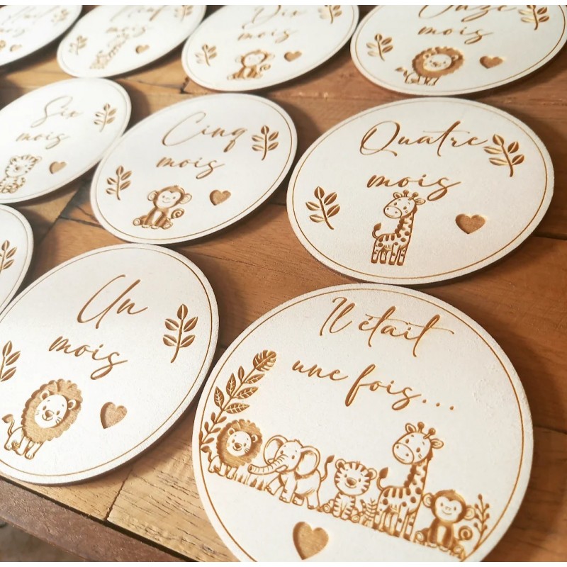 Capturez chaque moment précieux de la première année de votre bébé avec nos magnifiques cartes étapes en bois gravé. Décorées de délicats motifs d'animaux de la savane (lion, girafe, éléphant et plus), elles ajoutent une touche douce et élégante à vos souvenirs. Parfaites pour les séances photos mensuelles.Un cadeau idéal pour les futurs parents ou pour immortaliser la croissance de votre enfant.