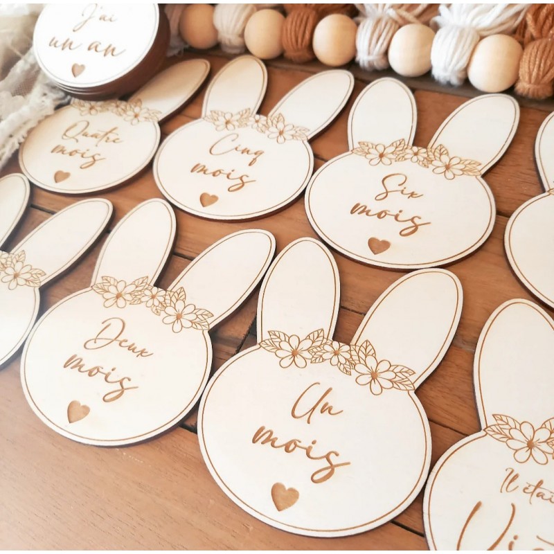 "Capturez chaque moment précieux avec nos adorables cartes étapes en forme de lapin ! Parfaites pour immortaliser les mois de bébé, ces cartes en bois délicatement gravées ajoutent une touche unique et chaleureuse à vos souvenirs. Un cadeau idéal pour les nouveaux parents !"