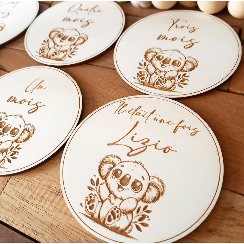 Un très beau lot de 13 cartes étapes koala en bois pour photographier votre bébé de la naissance à sa toute première bougie.