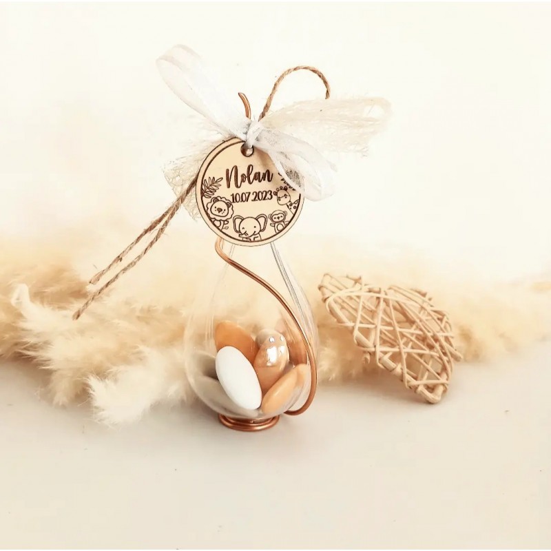 Sur le thème des animaux de la savane et d'Afrique, cette goutte à dragées sera un parfait cadeau pour vos invités lors du baptême de votre enfant.