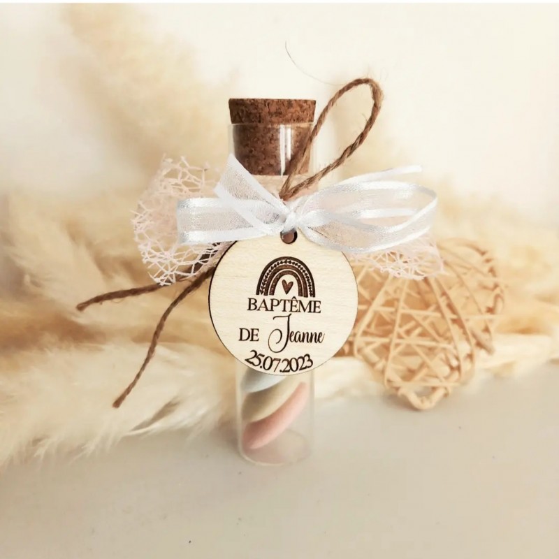 Avec son médaillon en bois arc-en ciel, cette éprouvette sera le cadeau idéal pour vos invités lors du baptême de votre enfant. Cette boîte à dragées est dans les tons rose, blanc et ivoire.
