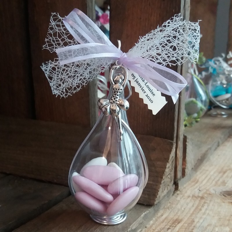 Magnifique goutte dans les tons parme, argent et blanc. Cette boite à dragées pourra convenir à toutes vos fêtes, que ce soit pour une communion, un baptême ou un mariage.