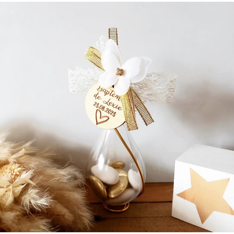 Dans les couleurs d'or et de blanc, nous avons créé cette goutte originale avec son papillon pour le baptême de votre enfant.