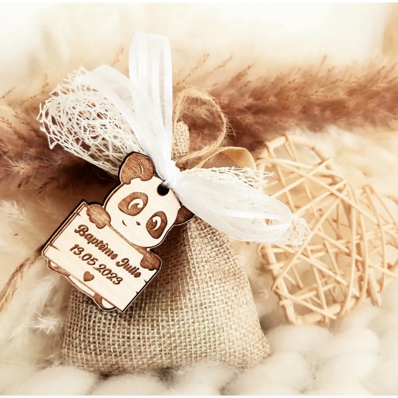Un magnifique contenant en toile de jute et son étiquette en bois panda.