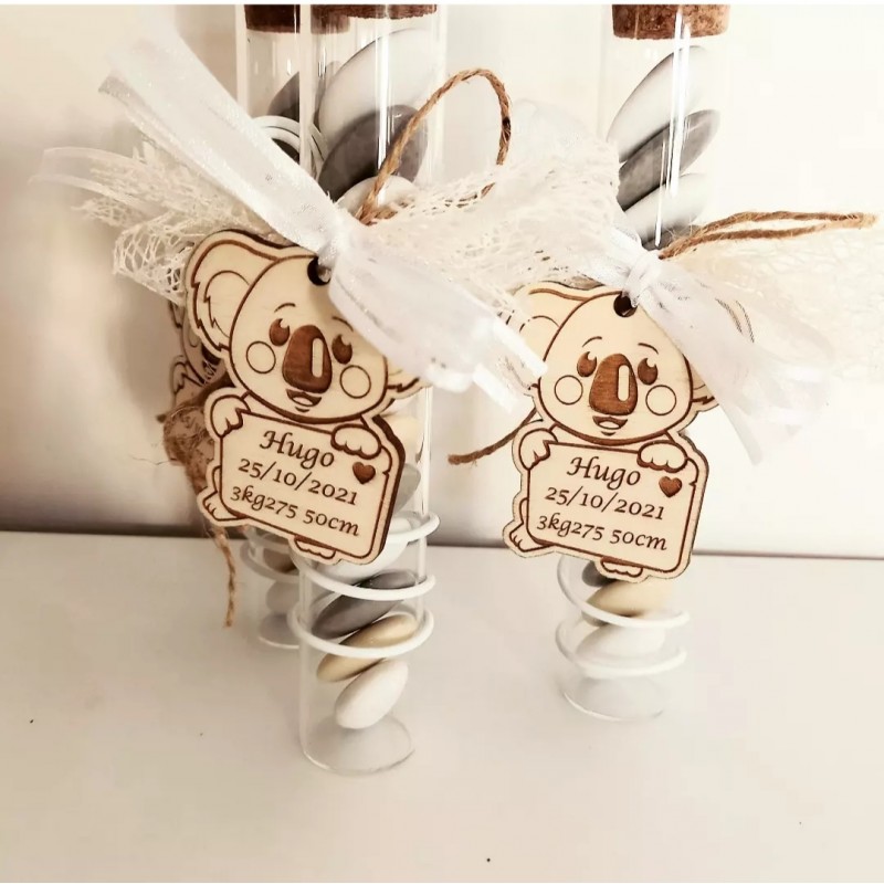 Un cadeau original et unique pour le parrain, la marraine et les grands parents de votre enfant avec cette grande éprouvette et son étiquette bois koala.