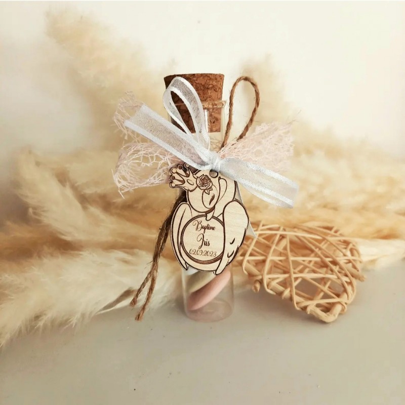 On adore cette éprouvette avec son cygne en bois gravé avec le prénom et la date de naissance ou de baptême de votre fille.