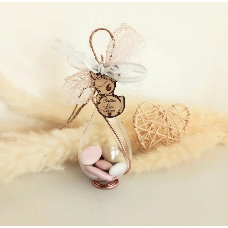 Un joli contenant de dragées en forme de goutte dans le thème biche dans les tons rose et blanc.