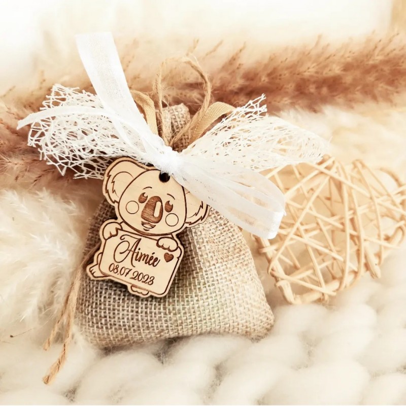 Un jolie petit pochon en toile de jute avec son koala gravé avec le prénom et la date de naissance ou de baptême de votre petit garçon.