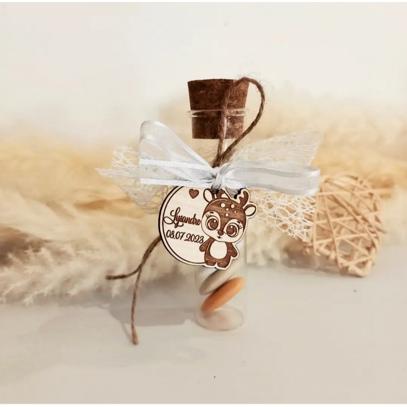 Ce faon en bois personnalisé décore merveilleusement notre éprouvette de dragées dans les tons ivoire et blanc.