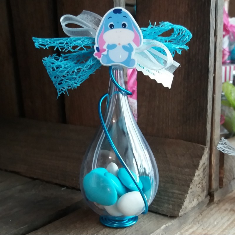 Une boite à dragées goutte originale bourriquet dans les tons bleu turquoise et blanc et sa figurine amusante.