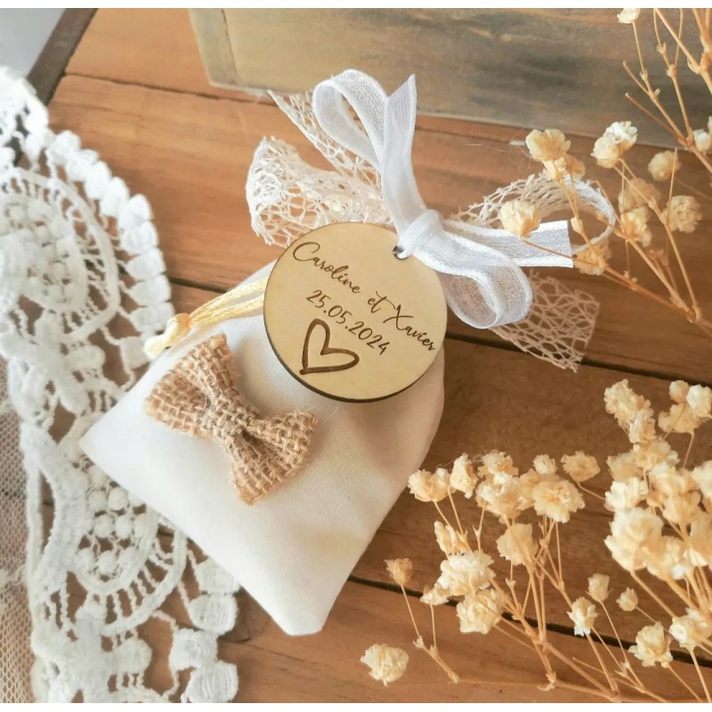 Parfait pour un mariage bohème chic et champêtre, ce merveilleux pochon en velours avec ses dragées sera parfait à offrir à vos convives.