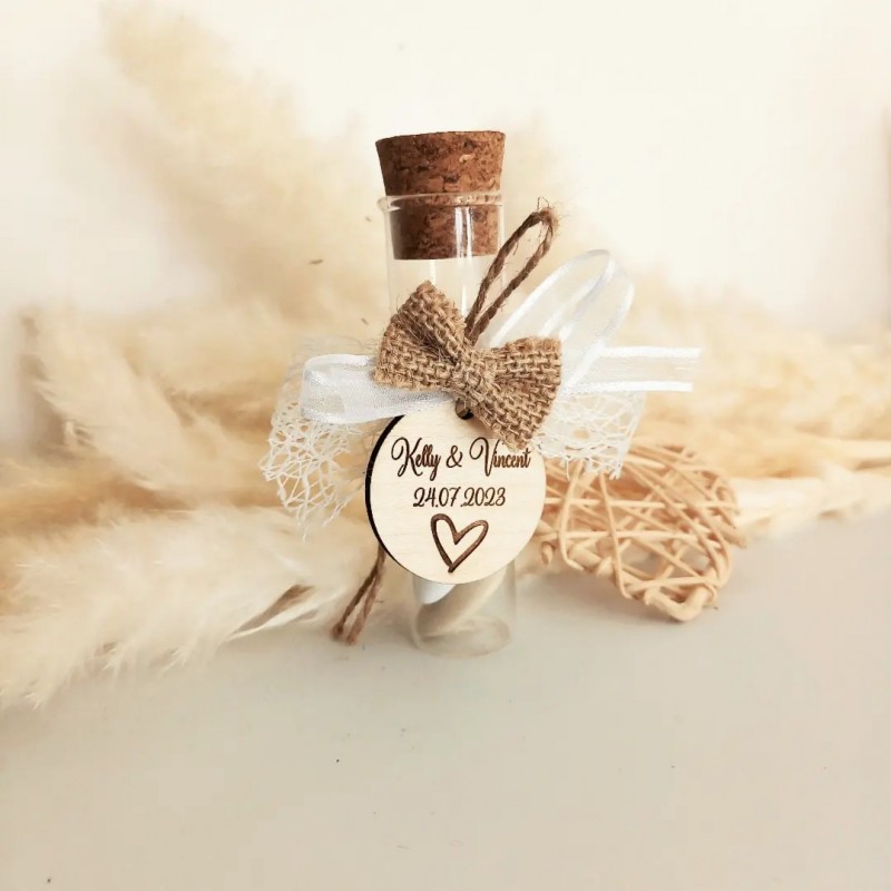 Avec son noeud en jute, cette magnifique éprouvette pourra convenir lors d'un mariage ou toute autre fête comme un baptême.
