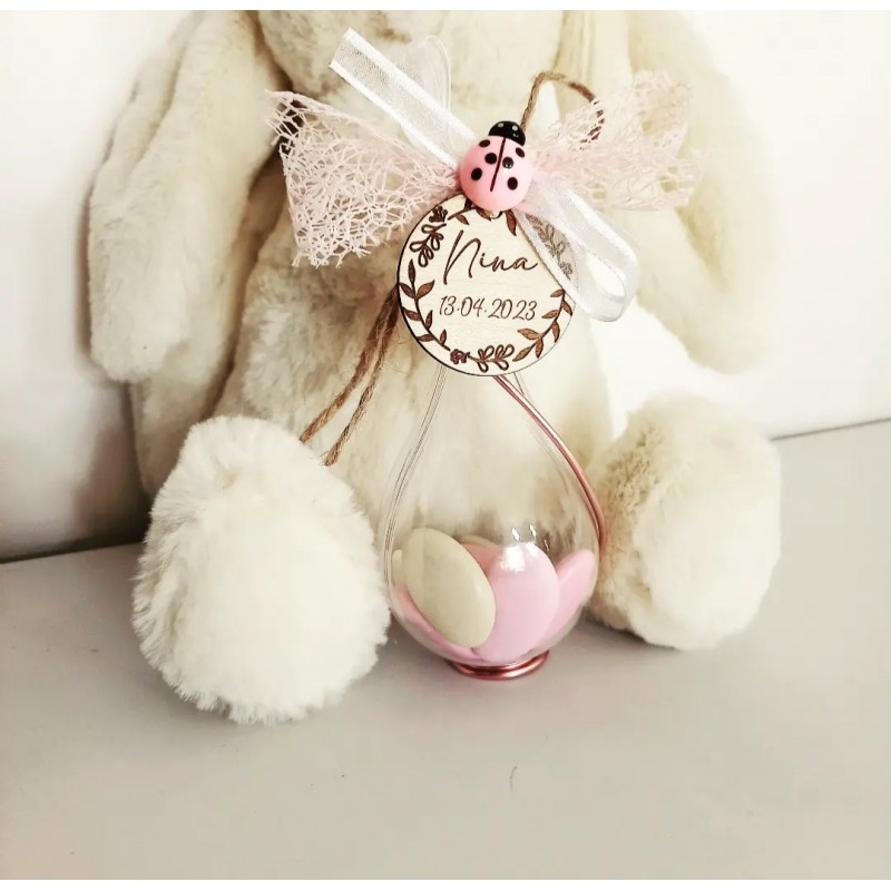 Des boites à dragées originales pour le baptême et la naissance avec cette boite à dragées goutte est agrémentée d'une magnifique petite coccinelle.