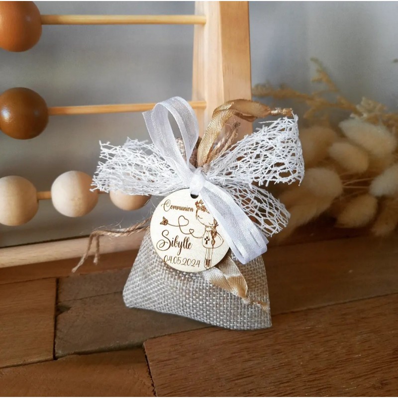 Un très beau pochon en toile de jute avec son médaillon original personnalisépour la communion d'une jeune fille.