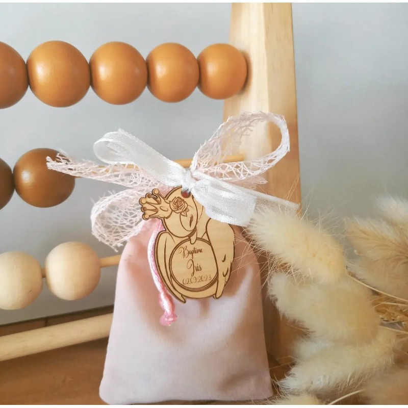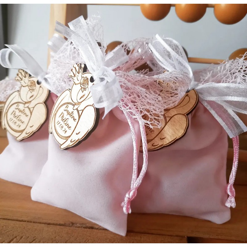 Nous vous présentons ce magnifique cygne gravé avec son pochon en velours rose pour un baptême sur ce thème.