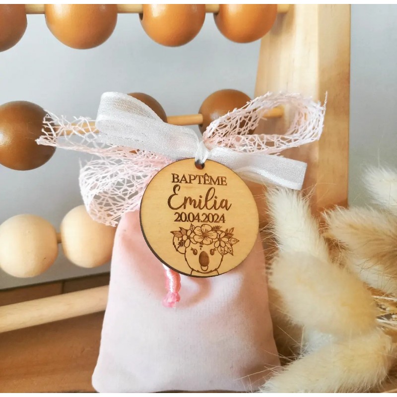 Une mignonne koala gravée avec son pochon en velours rose pour un baptême tout en douceur.