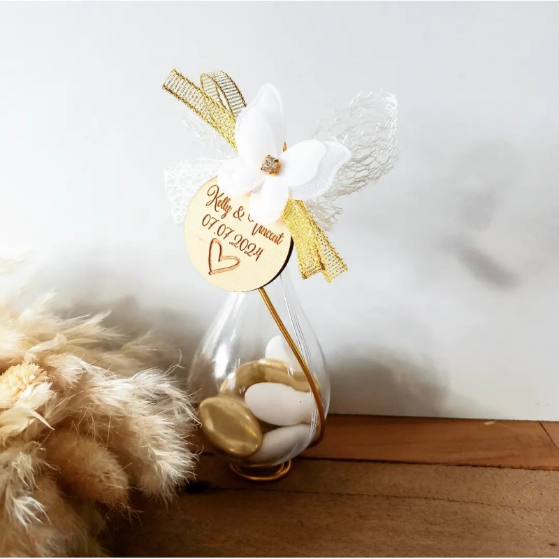 Une sublime goutte dans les couleurs or et blanc. Le contenant à dragées arbore joliment un noeud papillon assorti.