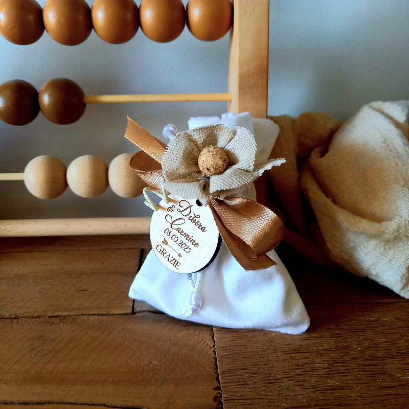 Une boite à dragées pour un mariage champêtre dans les tons ivoire, bois et nude