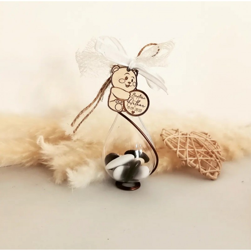 Notre adorable ourson est proposé sur notre goutte à dragées dans les tons marron, ivoire et blanc pour le baptême de votre enfant ou son anniversaire.