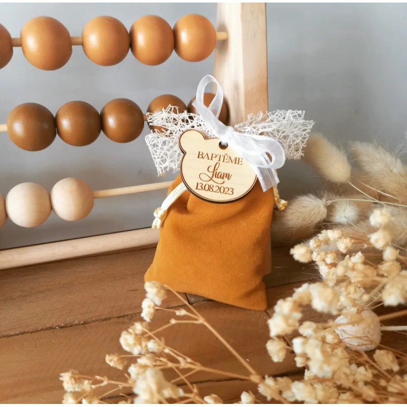 Un joli petit pochon en velours avec son étiquette en bois en forme de tête d'ourson gravée et personnalisée pour le baptême de votre petit garçon.