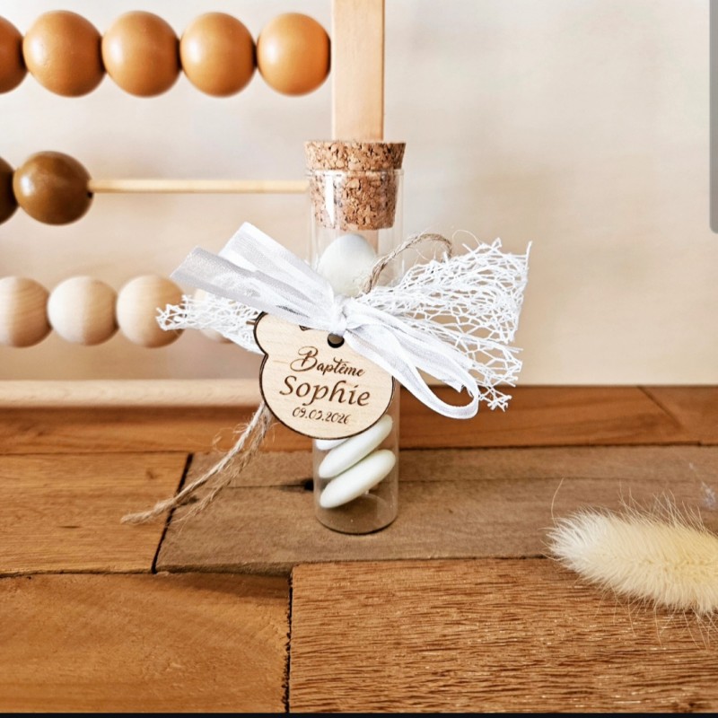 Une éprouvette toute mignonne avec sa tête d'ourson et ses rubans ivoire et blanc pour fêter le baptême de votre enfant.
