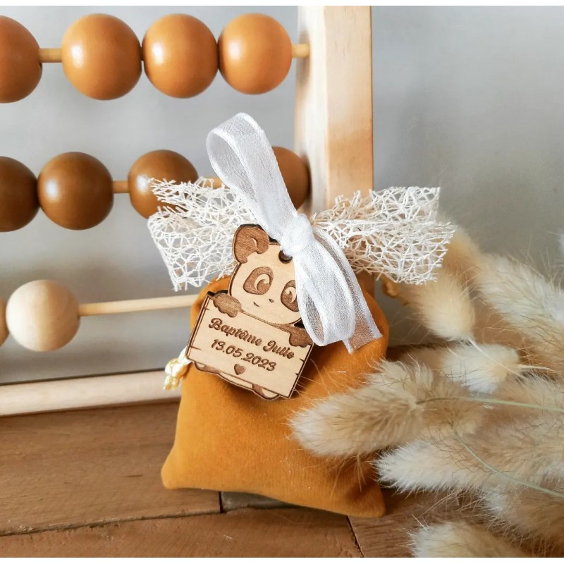 Un très beau pochon en velours avec son petit panda gravé et personnalisé pour le baptême de votre petit bout.