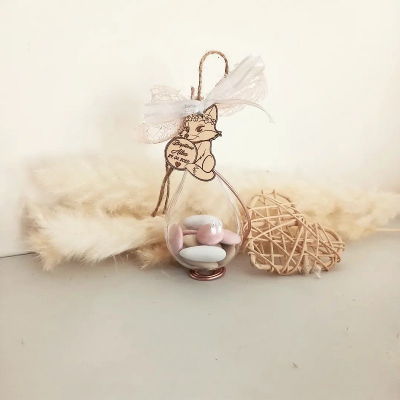 Cette magnifique renarde avec sa goutte à dragées dans les tons rose et blanc pour le baptême de votre petite fille.