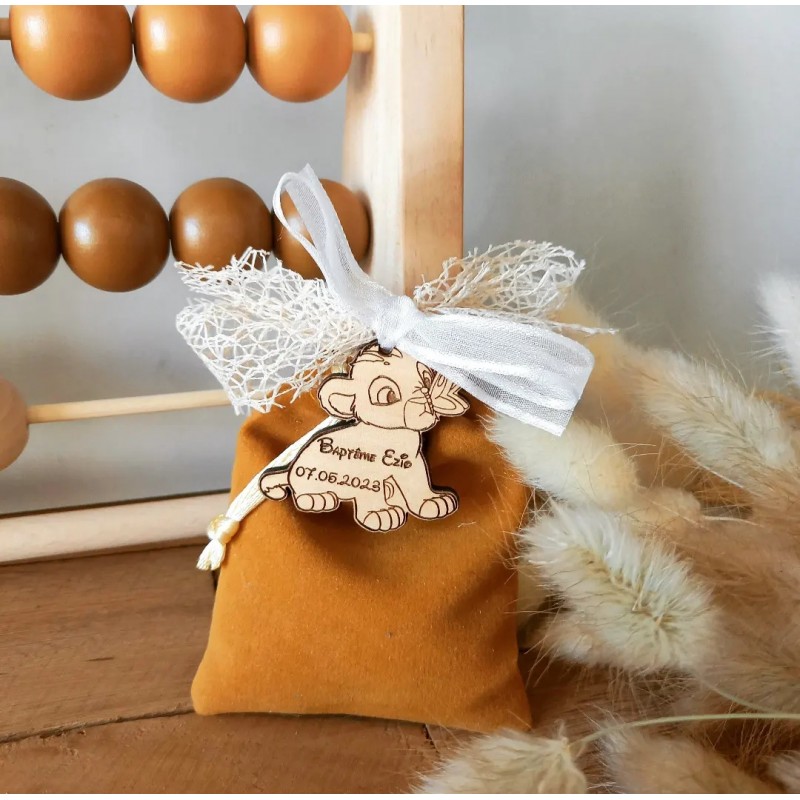 Ce mignon pochon en velours avec son étiquette de Simba sera un cadeau parfait pour un baptême sur ce thème.