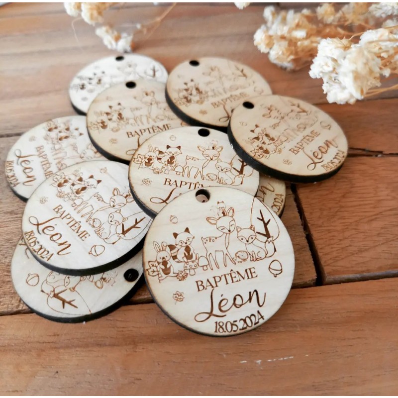 Étiquette ronde sur le thème des animaux de la forêt que vous pourrez personnaliser pour le baptême, la naissance ou l'anniversaire de votre enfant.