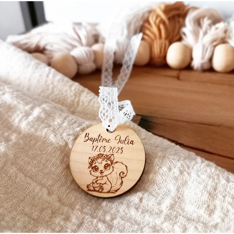Ajoutez une touche unique et naturelle à votre évènement avec cette étiquette en bois gravée d'une adorable écureuil. Parfaite pour un baptême, elle est personnalisée avec le texte et la date de votre choix. Avec son design raffiné, cette étiquette est idéale pour décorer vos cadeaux d'invités ou souvenirs. Un détail élégant, durable et écoresponsable pour rendre ce jour encore plus mémorable.