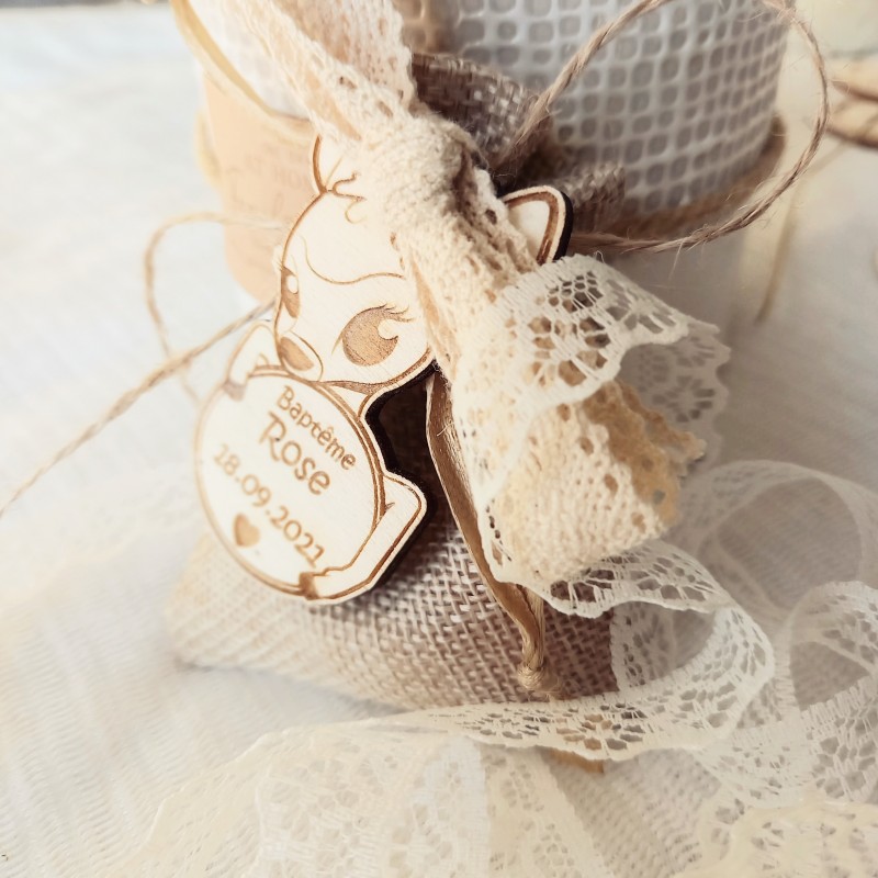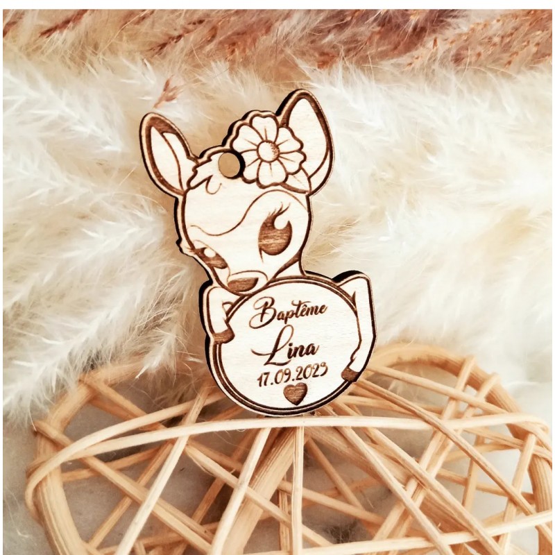 Une jolie biche en étiquette bois pour orner vos boîtes à dragées et ballotins pour le baptême, la naissance ou l'anniversaire de votre petite fille.