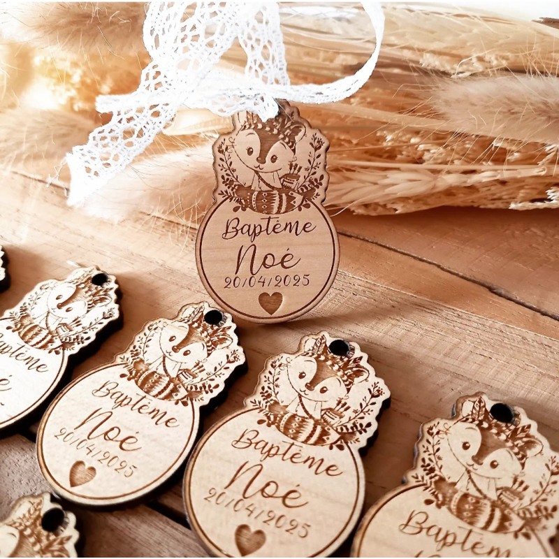 Un joli renard en bois qui accompagnera merveilleusement vos boîtes à dragées et ballotins pour un baptême, une naissance ou un anniversaire.