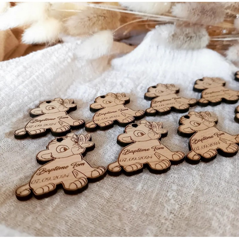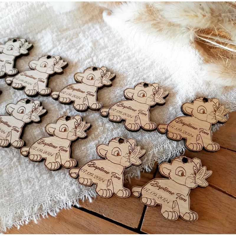Une jolie étiquette en bois pour vos boites à dragées sur le thème du roi lion.