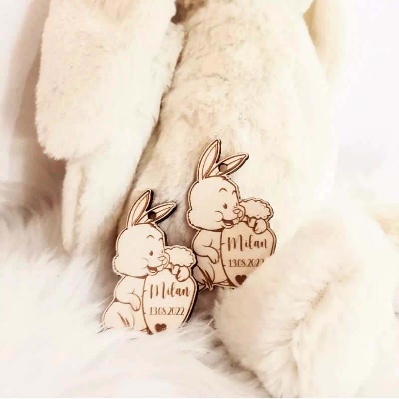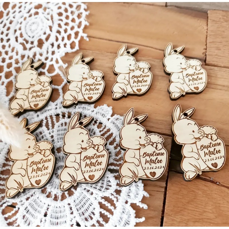 Pour décorer vos boîtes à dragées ou toute autre chose, voici notre étiquette en bois avec le lapin et sa carotte.