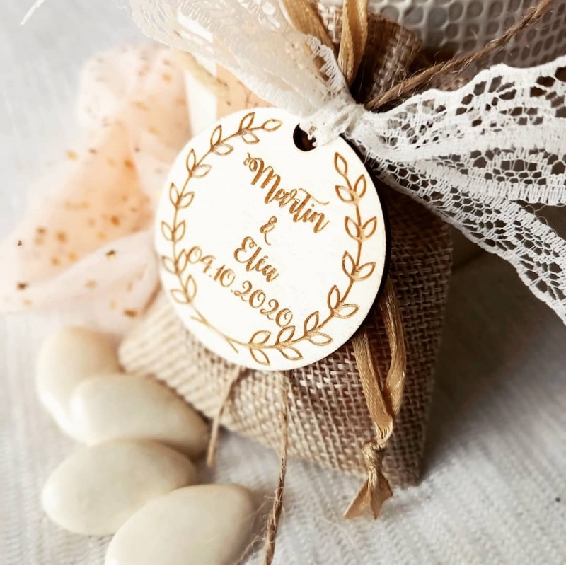 Une étiquette raffinée en bois pour décorer vos boîtes à dragées et ballotins pour votre mariage.