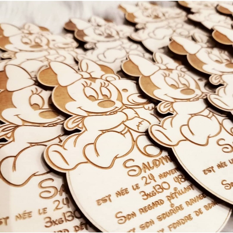 Un faire-part minnie magnétique en bois tout en originalité pour annoncer la naissance de votre petite fille ou son baptême.
