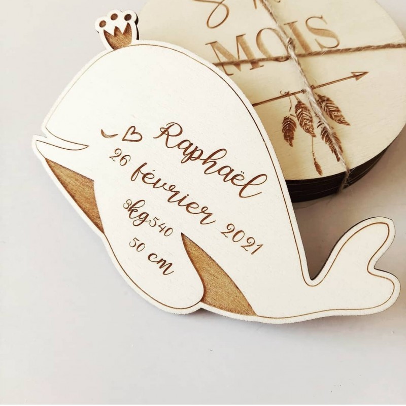 Sur le thème marin, nous vous proposons ce joli faire-part avec sa baleine en bois magnétique qui pourra parfaitement être offert pour la naissance ou le baptême de votre bambin.