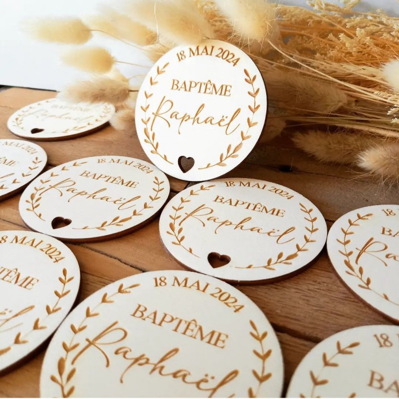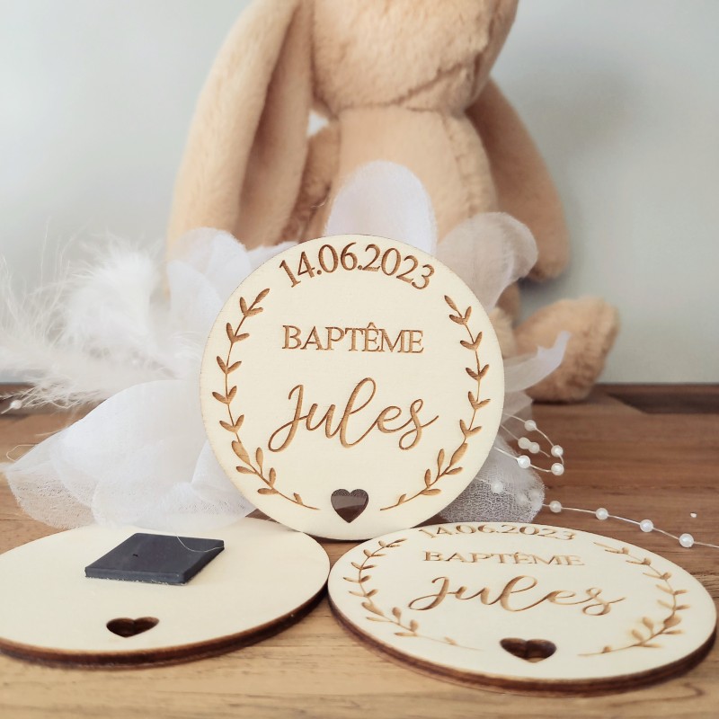 Ce magnet en bois avec sa couronne de feuilles pourra être offert le jour de votre fête en souvenir de cette magnifique journée ou pour annoncer le baptême, l'anniversaire, la communion ou toute autre fête à vos proches et amis.