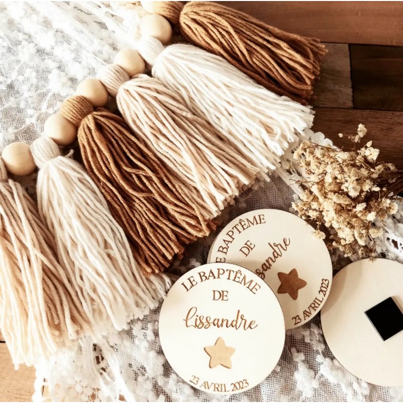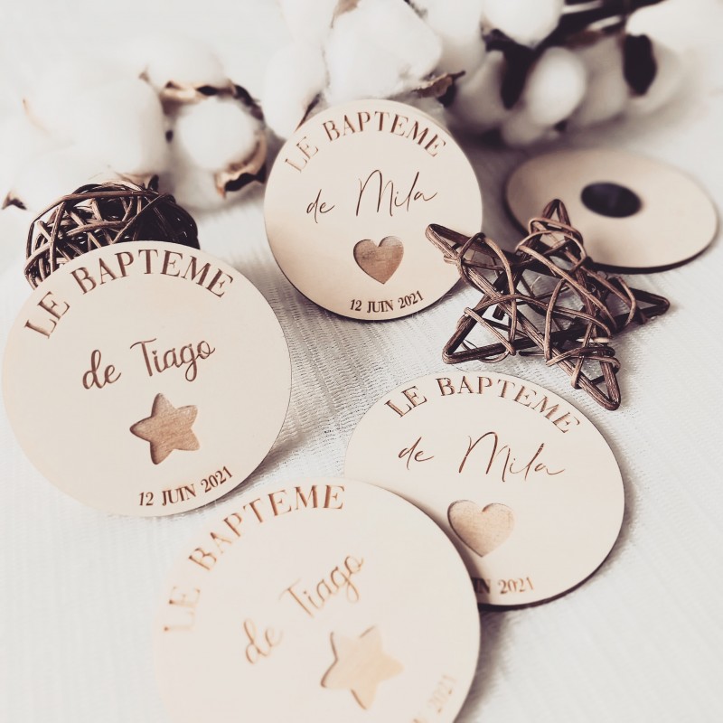 Une splendide alternative aux dragées avec ces magnets en bois personnalisés pour le baptême de votre enfant. Un joli souvenir à offrir à vos invités qui garderont précieusement.