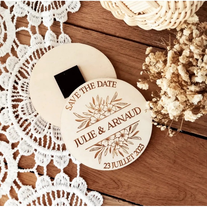 Un coup de coeur pour ce magnet mariage en bois floral qui fera un cadeau souvenir et une annonce originale pour vos invités.